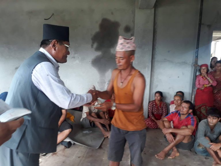 हेमबहादुरको परिवारलाई मण्डनदेउपुर नगरपालिकाका प्रमुख टोकबहादुर वाइवाले मृतकको किरिया खर्चका लागि नगद २५ हजार र अस्थायी आवास निर्माणका लागि १५ हजार हस्तान्तरण गरेका थिए । नगरस्तरीय विपत्त व्यवस्थापन समितिको बैठकले मृतकको परिवारलाई २५ हजार, अस्थायी आवास निर्माण गर्न १५ हजार तथा भैंसी, गाई, सुँगुर, बाख्रा मरेमा क्रमस १० हजार, पाँच हजार, दुई हजार र १५ सय दिने निर्णय गरे अनुसार रकम हस्तान्तरण गरिएको नगरप्रमुख वाइवाले बताए । पीडितहरुलाई गाउँमै पुगि प्रजिअ राउत, नगर प्रमुख तामाङले रकम हस्तान्तरण गरेका हुन् ।