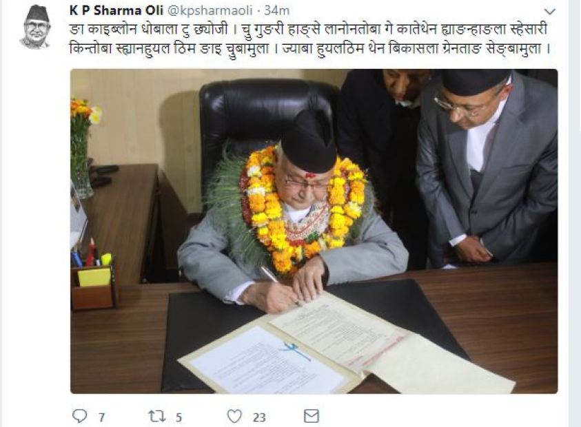 प्रधानमन्त्रीले नेपाली, अङ्गे्रजी, नेवारी, मैथिली र भोजपुरी भाषामा ट्विट गर्नुभएको हो । वर्तमान सरकार गत वर्ष फागुन ३ गते गठन भएको हो ।