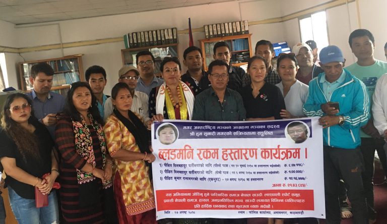 नेतृत्वकर्ता सुनारीका श्रीमती कुमारी सुनारी मगरको उपस्थितीमा नेपाल मगर संघका विदेश विभाग सचिव रक्षबहादुर रैका मगर, संघका कोषाध्यक्ष कमला थापामगर, नेपाल आदिवासी जनजाति पत्रकार महासंघ (फोनिज)का अध्यक्ष डण्ड गुरुङ, पारिवारिक सेवा समाज सादीका अर्जुन, गमन तामाङले ‘कुमार राना बचाउनका निम्ती ब्लडमणी संकलन अभियान’का संयोजक कृष्णप्रसाद ढकाल र कुमार रानाका श्रीमती अम्बिका रानालाई हस्तान्तरण गरिएको हो ।