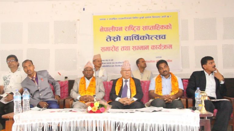 काठमाडौं (नेस) । नेपालीपन राष्ट्रिय साप्ताहिकले आफ्नो तेस्रो वार्षिकोत्सव मनाएको छ । सो अवसरमा विभिन्न क्षेत्रमा विशेष योगदान पु¥याएका व्यक्तिहरुलाई कार्यक्रममा प्रमुख अतिथि पूर्वप्रधानमन्त्री तथा नेपाल कम्यूनिष्ट पार्टी (नेकपा) का वरिष्ठ नेता माधवकुमार नेपालको सम्मान गर्नुभयो ।