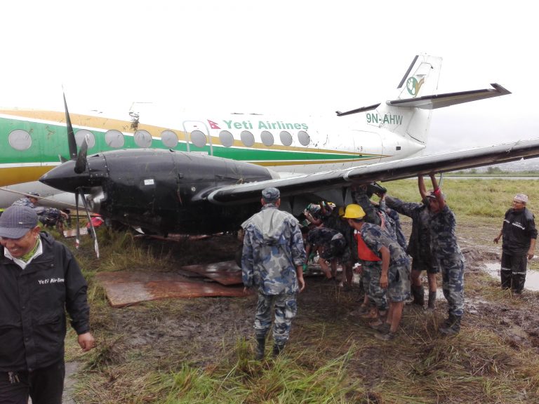 काठमाडौं । अवतरण गर्ने क्रममा धावनमार्गबाट चिप्लीएर घाँसे मैदानमा धसिएको यती एअरलायन्सको चार्टर विमानलाई एपीएफ टोलीले आफ्नो जनशक्ति तथा स्काभेटरको सहयोगमा आज धावनमार्ग हुँदै सुरक्षित स्थानमा पु¥याएको छ ।