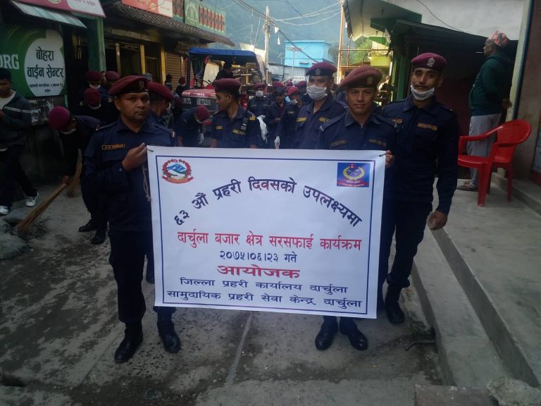 नेपाल प्रहरीको ६३ आंै प्रहरी दिवसको पुर्वसन्ध्यामा मंगलबार जिल्ला सदरमुकाम खलंगाको बजार क्षेत्रमा दार्चुला प्रहरीले सरसफाई गरेको छ । दिवसको पुर्वसन्ध्यामा प्रहरीले यसअघि टोल टोलमा प्रहरी अभियान अन्तर्गत विभिन्न जनचेतना मुलक कार्यक्रम आयोजना गरेकोमा मंगलबार बजार तथा मालिकार्जुन मन्दिर परिसरको सरसफाई गरेको हो ।