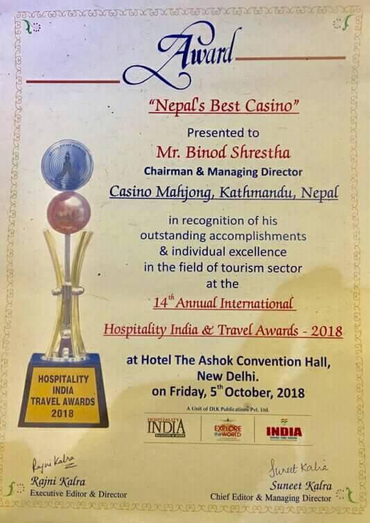 सोल्टी होटलको परिसरमा रहेको क्यासिनो महजोंगले सर्वाेत्कृष्ट क्यासिनो अवार्ड प्राप्त गरेको छ । भारतका पर्यटन मन्त्री के जे अल्फोन्स र संसदीय कार्य व्यवस्था मन्त्री विजय गोयलको प्रमुख आतिथ्यमा हालै नयाँ दिल्लीमा भएको विशेष समारोहमा क्यासिनो महाजोंगका प्रबन्ध निर्देशक विनोद श्रेष्ठको तर्फबाट कम्पनीका निर्देशक हेमन्त कक्षपति तथा कम्पनीमा जनरल म्यानेजर अमूल्य विक्रम राणालाई उक्त अवार्ड प्रदान गरिएको हो ।