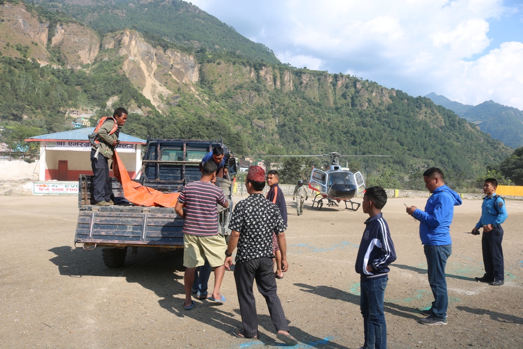 म्याग्दीको गूर्जा हिमाल आरोहणका क्रममा हिमआँधी र हुरीमा परेर ज्यान गुमाएका पर्यटकहरुको शव सङ्कलन गरेर काठमाडौं ल्याइएको छ । धौलागिरी गाउँपालिका–१, गूर्जामा पर्ने ७ हजार १९३ मिटर अग्लो गूर्जा हिमालको आधारशिविरमा हिमआँधी र हावाहुरीमा परेर मृत्यु भएकामध्ये ८ जनाको शव हेलिकप्टरमार्फत काठमाडौं ल्याइएको हो ।