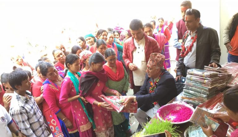 भण्डारीले विभिन्न विद्यालयमा अध्ययनरत ६ सय बढी विद्र्यार्थीलाई स्वीटर, ट्रयाकसुट र स्टेशनरीसहित ५० रूपैयाँ दक्षिणा दिएर टीका लगाइ दिएका थिए । माझी वस्तीकै झण्डै ५सय महिलालाई टीका लगाइ ५० रूपैयाँ दक्षिणा र लत्ता कपडा पनि वितरण गरेका छन् ।