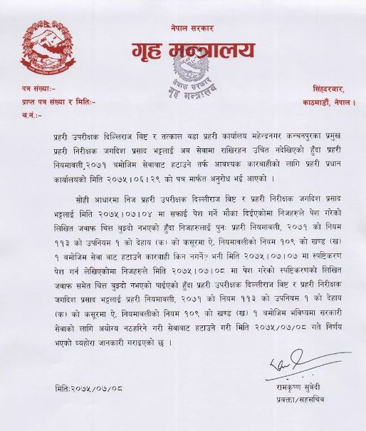 कञ्चनपुरकी १३ वर्षीया बालिका निर्मला पन्तको बलात्कार तथा हत्या प्रकरणमा प्रमाण नस्ट गर्ने कार्यमा संलग्न रहेको आरोप लाग्दै आएका कञ्चनपुरका तत्कालीन प्रमुख प्रहरी उपरीक्षक (एसपी) डिल्लीराज विष्ट र प्रहरी निरीक्षक जगदीश भट्टलाई गृह मन्त्रालयले बर्खास्त गरेको छ ।