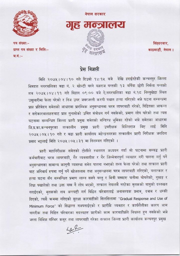 आधा दर्जनभन्दा बढी प्रहरी टोलीले घटनाको छानवीन गरे पनि परिणाम शून्य भएको अवस्थामा सरकारले कञ्चनपुरका तत्कालीन प्रहरी प्रमुख विष्ट र प्रहरी निरीक्षक भट्टलाई बर्खास्त गर्न प्रक्रिया अघि बढाएको हो। उनीहरुमाथि घटनास्थलको सुरक्षा नगरेको एवं प्रमाणहरू नस्ट गरेको आरोप लाग्दै आएको थियो ।