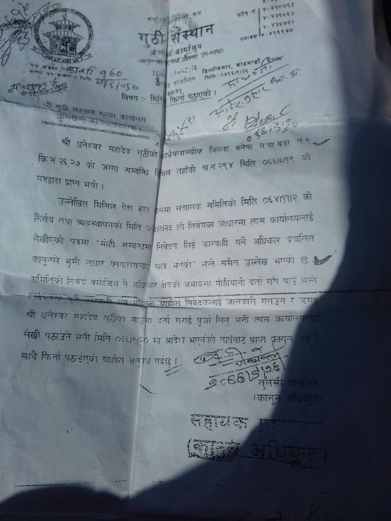 मालपोत कार्यालयले बनेपा नगरपालिका वडा नं ११ बाट कित्ता नं २६ र २७ को जग्गा जग्गधनीमा धनेश्वर महादेव गुठी र मोहीमा प्रल्हाद, विदुर, विनु, प्रदिप, सिता शर्मा, हरिप्रसाद जंगमहरु कायम गरि नामशारी गरिदिन सिफारिस गरिएको जनाएको छ । मालपोत कार्यालयको सुचनामा गुठी संस्थान काभ्रेले भने २०६५ श्रावण २७ गते उल्लेखित दुवै कित्ताहरुको जग्गा धनी जलेश्वर महादेव गुठी जनाई मोहि सम्बन्धि कारवाही भुमिसुधार कार्यालयबाट हुने गरि जग्गा दर्ता प्रमाणपुर्जा गुठी संस्थान कार्यालयमा पठाउन लेखेको देखिन्छ । यहा जलेश्वर र धनेश्वर नाम फरक देखिन्छ ।