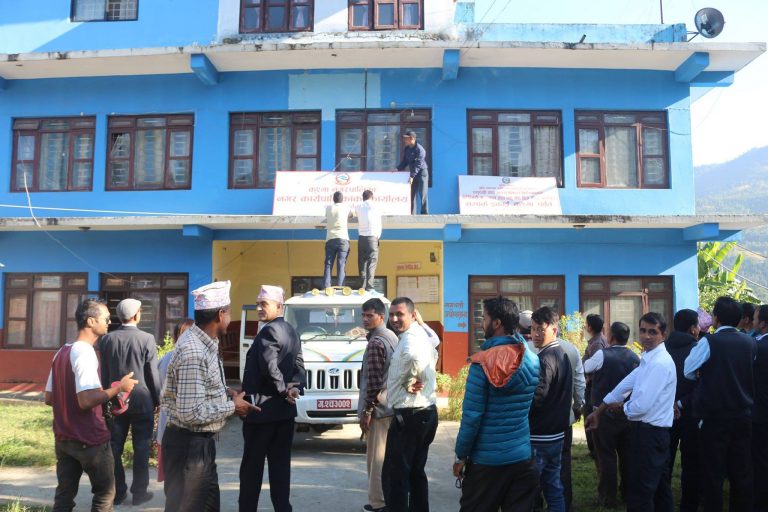 कुस्मा नगरपालिकाका वडा अध्यक्षहरु र कर्मचारी पुगेर दुई सरकारी कार्यालयमा नगर कार्यपालिकाको साइनबोर्ड टाँगेका हुन ।