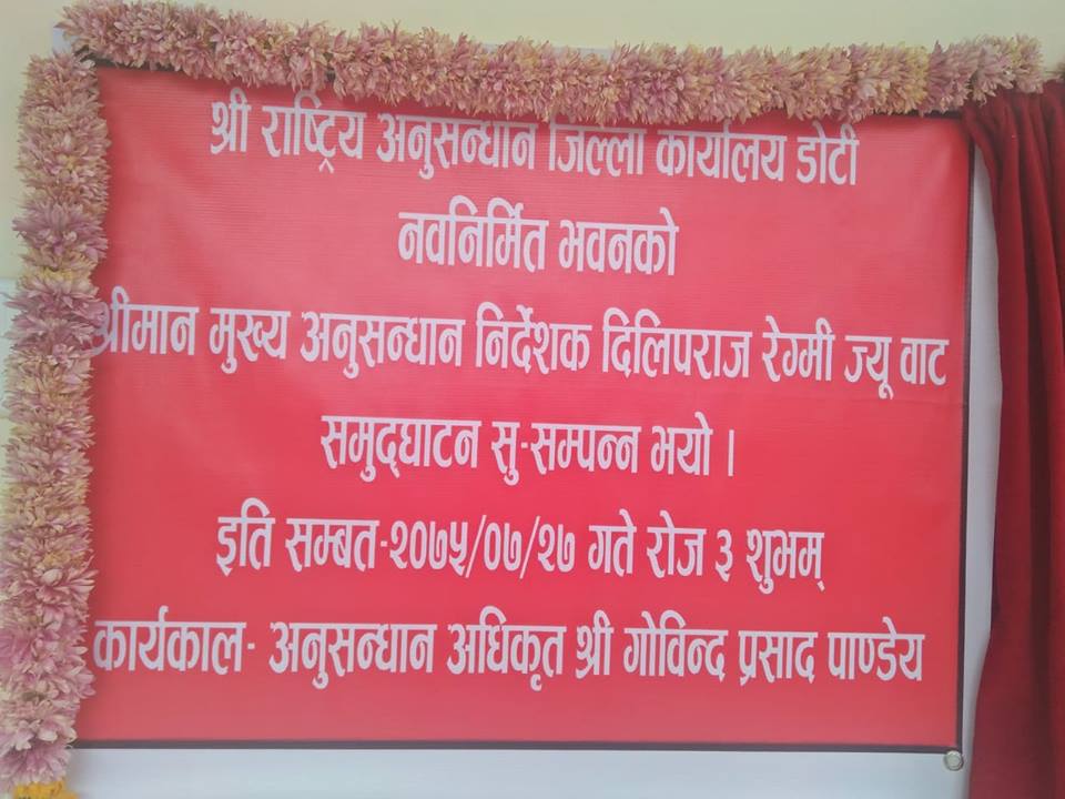 नव निर्मित भवनको उद्घाटन गर्नु हुदै राष्ट्रिय अनुसन्धानका मुख्य अनुसन्धान निर्देशक (चिफ) दिलिपराज रेग्मीले अनुसन्धानका कर्मचारीले बिगतको भन्दा झन चनाखो र फुर्तिलो भएर काम गर्नु पर्ने निर्देशन दिनु भएको थियो । उक्त कार्यक्रममा जिल्ला अदालतका माननिय न्याधिस जयानन्द पनेरु,डोटीका निमित्त प्रमुख जिल्ला अधिकारी टेकनारायण पौडेल,प्रहरी प्रबक्ता तथा डिएसपी लालबहादुर धामी लागयतका अन्य बिभिन्न कर्मचारीहरुको उपस्थिती रहेको थियो ।