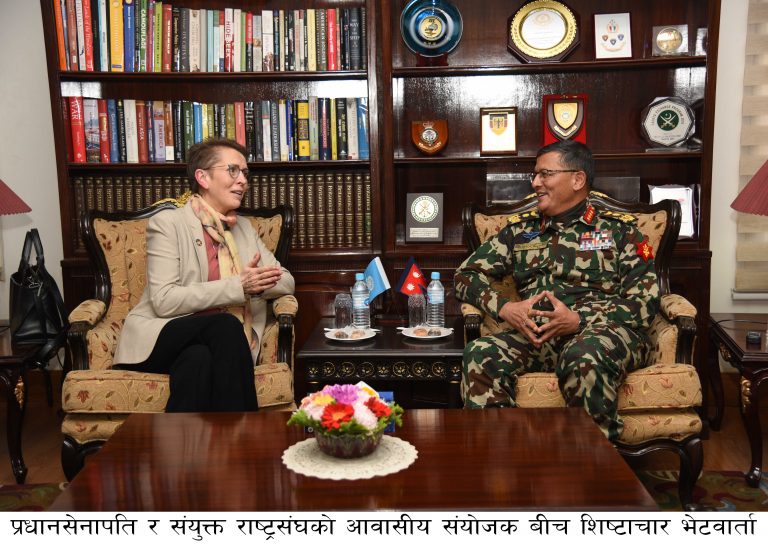 प्रधानसेनापति पूर्णचन्द्र थापा र संयुक्त राष्ट्रसंघको आवासीय संयोजक भेलेरी जुलीनाण्डबीच शिष्टाचार भेटवार्ता भएको छ । भेटवार्ताका क्रममा प्रधानसेनापति थपाले र भेलेरीबीच द्धिपक्षीय हित तथा पारस्परिक सम्बन्धका विषयमा छलफल भएको थियो ।