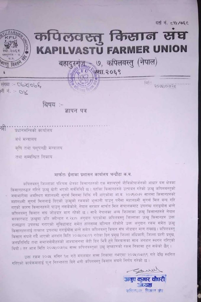 नेपाल सरकारबाट किसानहरुले पाउनुपर्ने अनुदान रकम छिटोभन्दा छिटो उपलब्ध गराइयोस् भन्ने किसानहरुको मागलाई सरकारले हालसम्म बेवास्ता गर्दै आएको छ । अन्य जिल्लाका उखु किसानले नेपाल सरकारबाट उखुमा प्रतिक्वीन्टल रु.२५ अनुदान उहिल्यै पाइसकेपनि कपिलवस्तुका किसान भने हालसम्म पनि बन्चित रहेका छन् ।