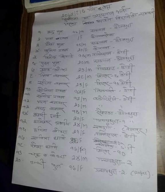 सरिता बलायर (२९) शिखर १० डोटी, सोनिया रावल (१५) तिलनाली डोटी, सन्तोष रावल (१५) बन्डोसैनी डोटी, भरत बलायर (२०) बन्डोसैनी डोटी, नारद बलायर (१६) सेल्तडा डडेल्धुरा, इश्वरी दमाई गन्यापधुरा १ डडेल्धुरा, थानेश्व।र अवस्थी (२४) नवदुर्गा बेलापुर, हरिना बोहोरा (२१) तल्लिसाल डोटी, सावित्रा धामी (३८) डोटी, रमेश धामी (१७) शिखर १० डोटी, चक्रबहादुर बोहोरा (२४) गन्यापधुरा ३ डडेल्धुरा, डम्बरी भुल (१७) गन्यापधुरा ३ को उपचार भइरहेको छ ।