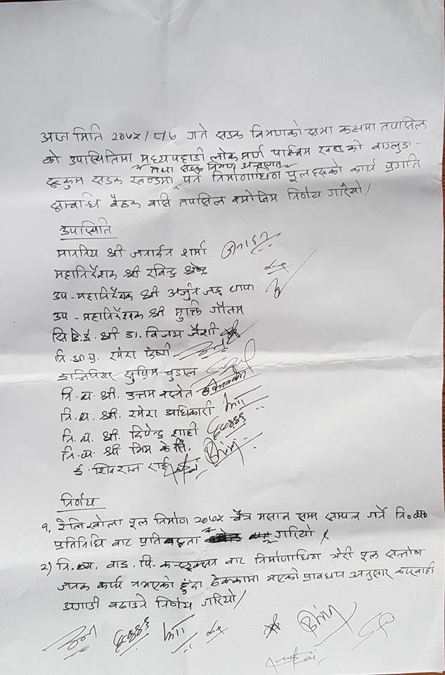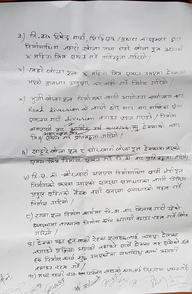 ठेक्कापट्टा हुन बाँकी रहेका पुलहरुलाई क्रमशः ठेक्का लगाउने प्रक्रिया अगाडि बढाउने साथै ठेक्का भइसकेका पुलको निर्माण कार्य शुरु नभएकामा यथाशीघ्र कार्य अगाडि बढाउन पहल गर्ने निर्णय पनि बैठकले गरेको छ । मध्यपहाडी सडक निर्माणको कामलाई तिब्रता दिने गरी दश बुँदे निर्णयमा सरोकारवालाहरुले हस्ताक्षर गरेका छन् । निर्णयमा पूर्वमन्त्री एवं सांसद शर्मा, सडक विभागका महानिर्देशक रबीन्द्र श्रेष्ठ, उपमहानिर्देशक अर्जुनजङ् थापा, उपमहानिर्देशक मुक्ति गौतम, सिनियर डिभिजन इञ्जिनियर डा। बिजय जैशी, निर्माण आयोजना प्रमुख रमेश दृष्टि, इञ्जिनियर सुप्रिम चुडाल, निर्माण ब्यवसायीहरु उत्तम बस्नेत, रामेश अधिकारी, दीपेन्द्र शाही, भीम केसी र इञ्जिनियर शिवराज राइले हस्ताक्षर गर्नुभएको छ ।