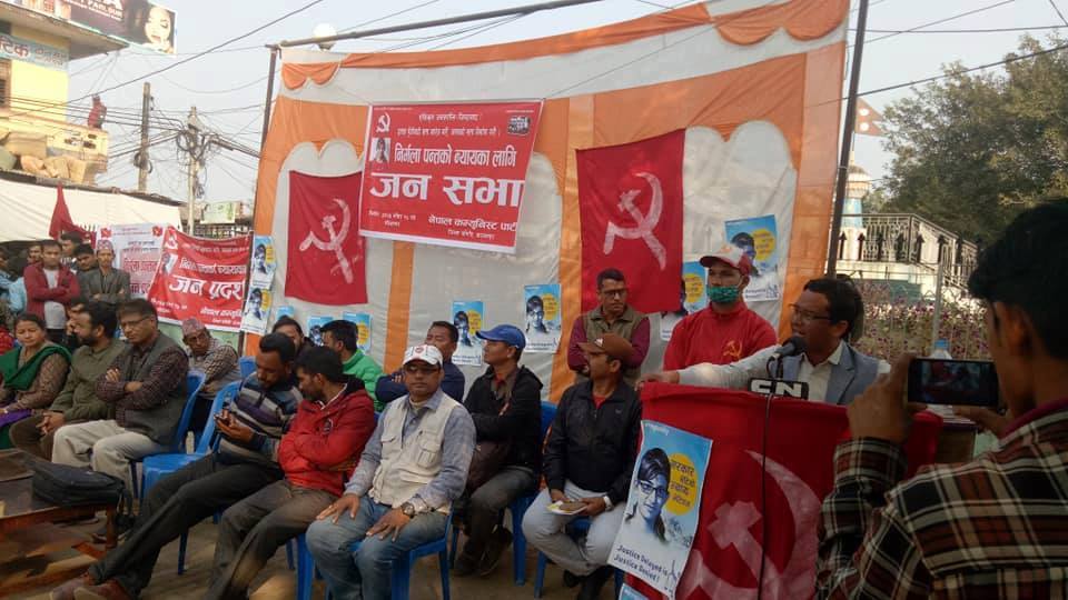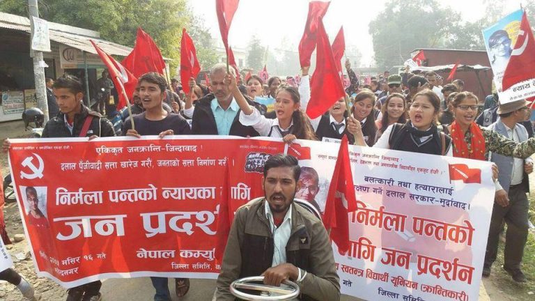बलात्कार पछि हत्या गरिएकी कञ्चनपुरकी बालिका निर्मला पन्तको पक्षमा न्यायको माग गर्दै नेत्रविक्रम चन्द (विप्लव) नेतृत्वको नेपाल कम्युनिष्ट पार्टीले महेन्द्रनगरमा जन प्रदर्शन गरेको छ । नेकपा (विप्लव) तथा उसको विद्यार्थी संगठनको आयोजनामा आईतवार कञ्चनपुर सदरमुकाम महेन्द्रनगरमा जन प्रदर्शन गरेको हो । घटना घटेको चार महिना भैसक्दा पनि दोषीलाई कानूनी दायरामा नल्याइएको बिरोधमा दवावस्वरुप जन प्रदर्शन गरिएको नेकपा ९विप्लव० कञ्चनपुरले जनाएको छ ।