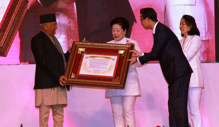 उक्त अवार्ड आयोजक युनिभर्सल पिस फेडरेसनले आइतबार आयोजित समापन समारोहमा ओलीलाई १ लाख डलर राशिको अवार्ड दिएको हो ।