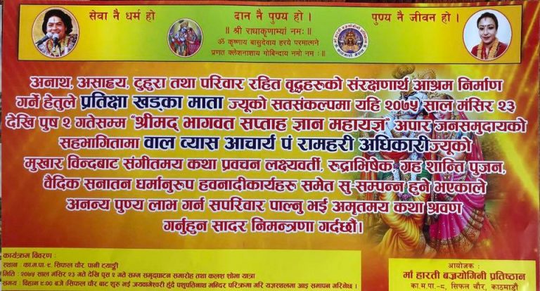 अनाथ, असाहय, टुहुरा तथा परिवाररहित बृद्धहरुको संरक्षणका लागि आश्रम निर्माण गर्ने उद्येश्यले आगामी सोमबारबाट पौष २ गतेसम्म काठमाडौंको वडा नम्बर ९ मा श्रीमद् भागवत ज्ञान महायज्ञ लगाइने भएको छ ।