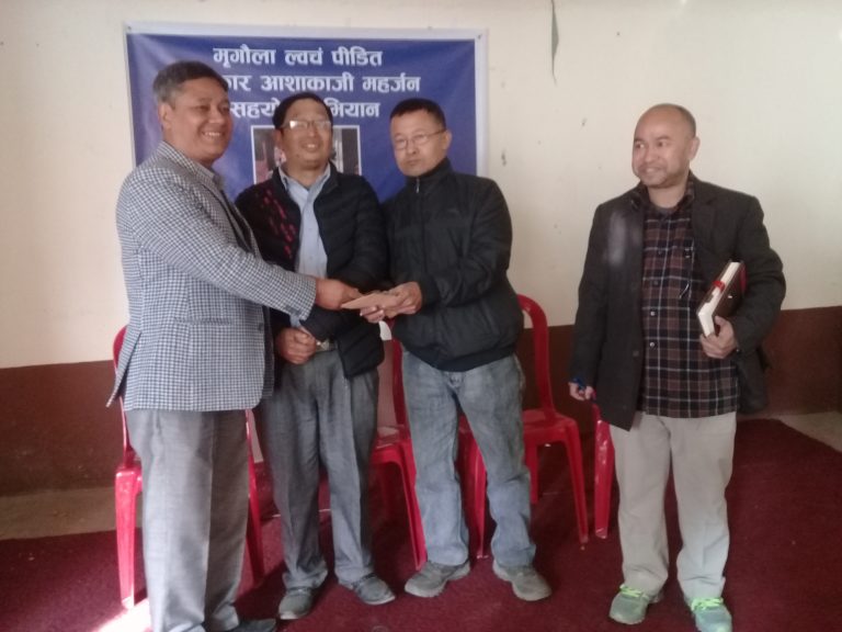 त्यसैगरी आदिवासी जनजाति पत्रकार महासंघ, सुरबहादुर श्रेष्ठ र रामशरण साय्मीले ५÷५ हजार रुपैया सहयोग गर्ने घोषणा गर्नुभयो । त्यसैगरी पत्रकारद्वय उत्तम श्रेष्ठ र उपेश महर्जनले क्रमशः १ हजार रुपैया“ र १ हजार ५ सय ५५ रुपैया“ सहयोग गर्ने प्रतिबद्धता गर्नुभयो ।