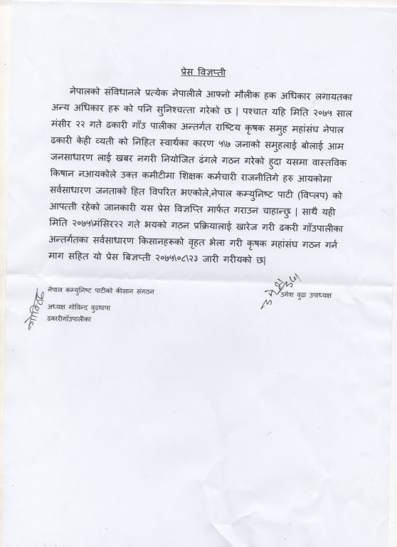 नेपालको संबिधानले प्रत्येक नेपालीलाई आफ्नो मौलिक हक अधिकार लगाएतका अन्य अधिकारहरुको सुनिश्चितता गरेको उल्लेख गर्दै ढकारी गाउँपालिकामा यहि मंसिर २२ गते सम्पन्न गाउँपालिका अन्तरगत राष्ट्रिय कृषक समुह महासंघ नेपालका ढकारी गाउँपालिकाका केही ब्याक्तिको निहित स्वार्थका कारण पाँच सात जनाको समुहलाई बोलाई आम जनसाधारणलाई खबर नगरी नियोजित ढङ्गले गठन गरिएको प्रति आपत्ति जनाउदै महासंघमा वास्तविक किसान नआएर राजनीतिज्ञ,शिक्षक, कर्मचारी आएको मा नेपाल कम्युनिष्ट पार्टी (बिप्लप) ो आपत्ति रहेको नेपाल कम्युनिष्ट पार्टीको किसान संगठन ढकारी गाउँपालिका अध्यक्ष गोबिन्द बुढथापा र उपाध्यक्ष उमेश बुढाद्धारा हस्ताक्षरित बिज्ञप्तीमा उल्लेख गरिएको छ ।