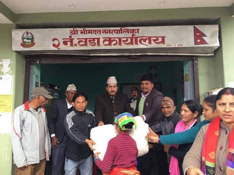भीमदत्त नगरपालिका वडा नं। २ मा विपन्न परिवारलाई न्यानो कपडा वितरण गरिएको छ । भीमदत्त नगरपालिकाका नगर प्रमुख सुरेन्द्र विष्टका प्रमुख आतिथ्यमा सोमबार कार्यक्रम गरी २६ जनालाई सिरक वितरण गरिएको छ ।