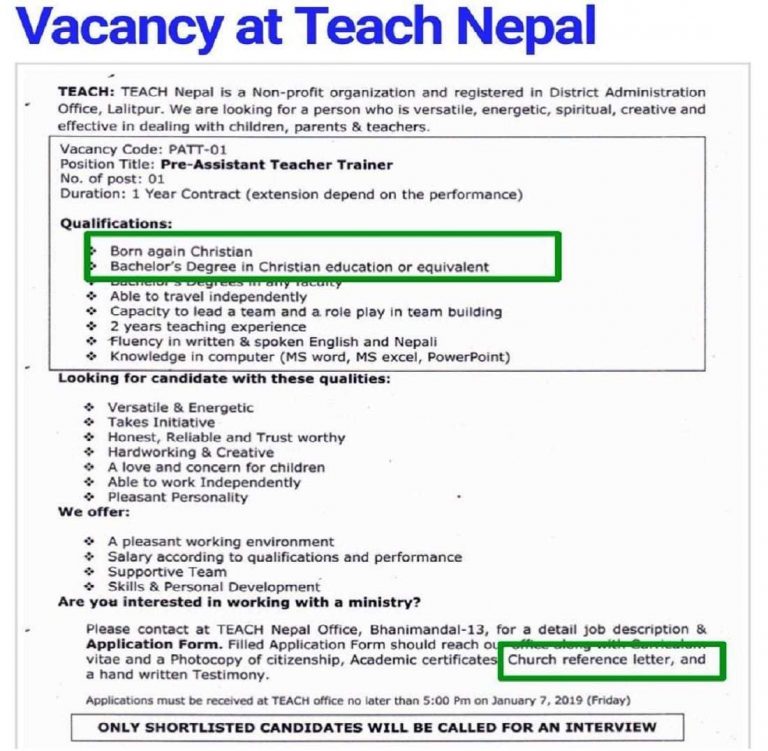काठमाडाैं । टिच नेपाल नामक एउटा गैरसरकारी संस्थाले जागिरका लागि तोकेको मापदण्डमा शिक्षकको जागिर खानका लागि क्रिश्चियन परिवारमै जन्मिएको हुनुपर्ने राखिएकाे छ। अनि क्रिश्चियन शिक्षामै स्नातह तह पास गरको हुनुपर्ने छ। त्यति मात्रै होइन, चर्चको प्रमाणीकरणको पत्र पनि साथमा हुनुपर्ने जिकिर उक्त विज्ञापनमा गरिएको छ।