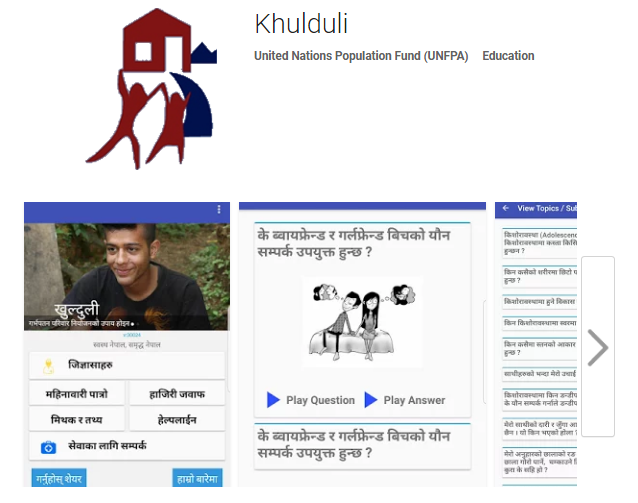 किशोरावस्थाको यौन तथा प्रजनन स्वास्थ्य प्रवद्र्धन गर्न स्वास्थ्य शिक्षा सूचना तथा सञ्चार केन्द्रले संयुक्त राष्ट्रसङ्घीय जनसङ्ख्या कोष ९युएनएफपीए० र जर्मन विकास सहयोग ९जिडिसी० को सहयोगमा निर्मित ‘खुल्दुली’ मोबाइल एप्स पोखरामा सार्वजनिक गरिएको छ ।