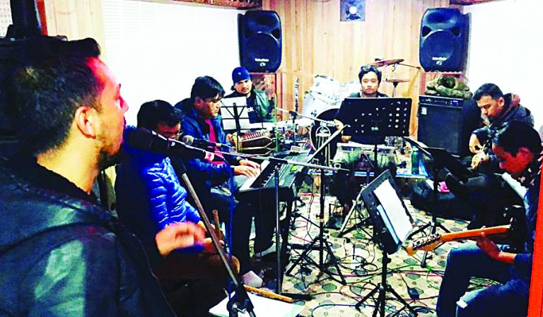 गायक रामकृष्ण ढकाल प्रस्तुतिका लागि सांगीतिक समूहका साथ पूर्वाभ्यास गर्दै।
