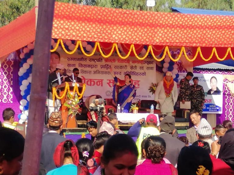 राष्ट्रपति बिद्यादेबी भण्डारीले कृषिको आधुनिकरण गर्न सबै लाग्नु पर्ने बताउनु भएको छ । बुधबार झापाको गौरादह स्थित महारानीझोडा साना किसान सहकारी संस्थाले प्रवद्र्धन गरेको नमुना एकीकृत सहकारी खेती अवलोकन गर्दै यस्तो बताउनुभएको होे । युवाहरुलाइ यसमा आकर्षण गर्न सक्नु पर्ने भन्दै उहाँले कृषिमा मुलकलाइ आत्मनिर्भर बनाउनु पर्नेमा जोड दिनुभयो । नमुना एकीकृत सहकारी खेती हरेक किसानहरुका लागि एउटा प्रेरणा भएको बताउनु भएको छ ।