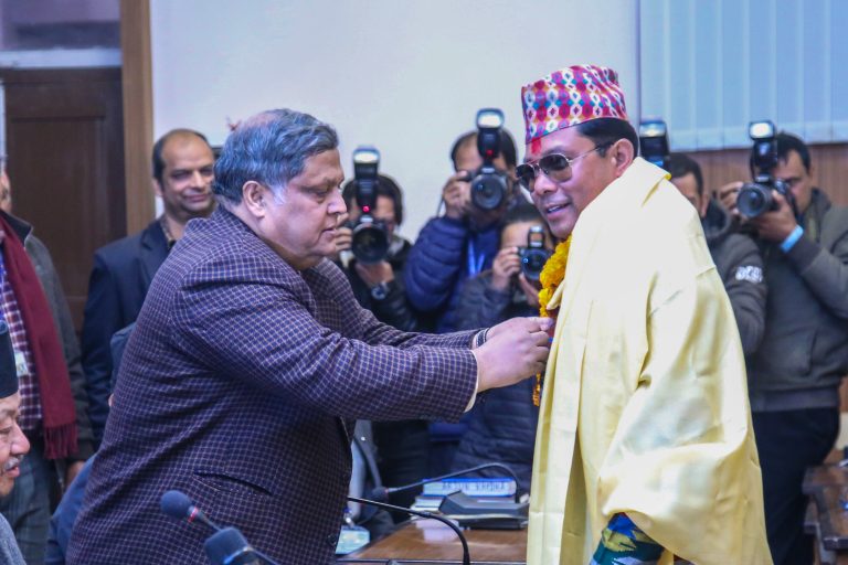 शपथपछि माला र खादा लगाएका चौधरीले गुरुङतिर फर्केर भने–‘धेरै दिनपछि भेट भयो है । हामी त धनगढी कार्यक्रममा पनि सँगै थियौं, दाइअघि आउनुभयो म पछि आएँ ।’