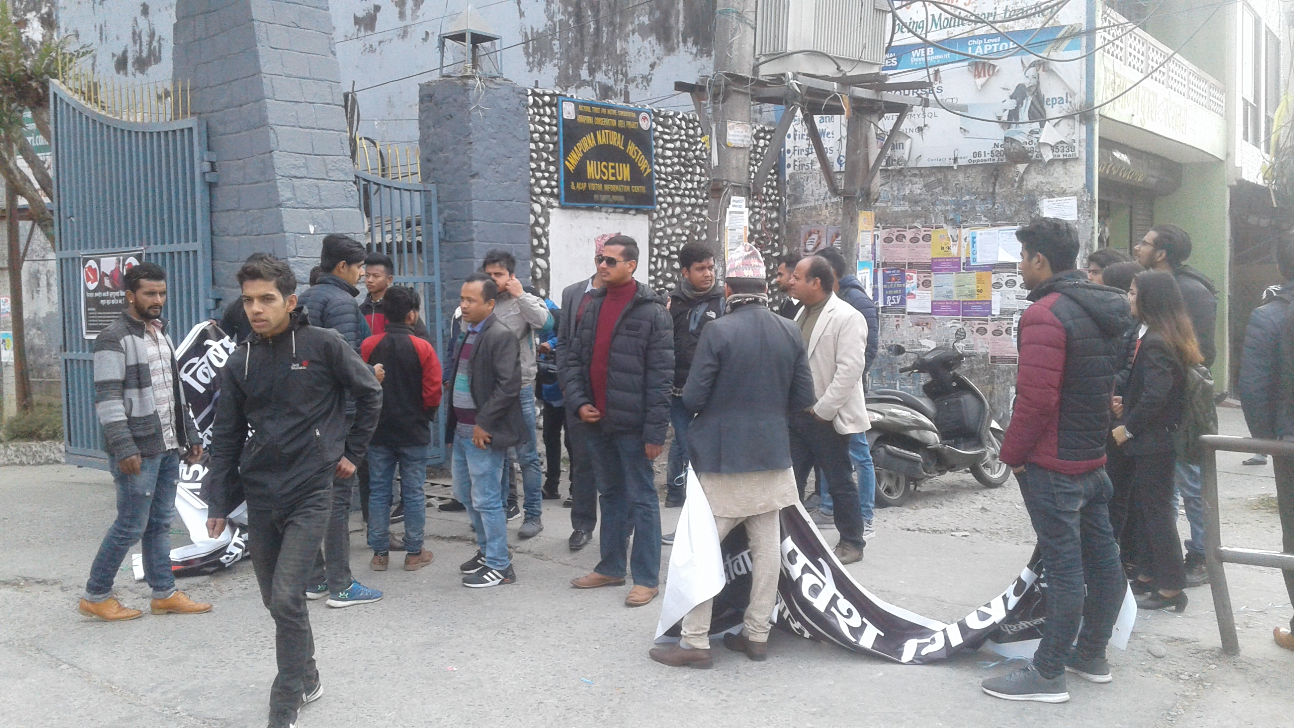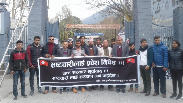 नेविसंघले पोखराको पृथ्वीनारायण क्याम्पसमा भ्रष्टाचारीलाई प्रवेश निषेध भन्दै विरोध स्वरुप व्यानर टालेका छन । प्रत्येक टोलटोल र घरघरमा भ्रष्टाचार गर्नेलाइ प्रवेश गर्न रोक लगाउनु पर्ने भन्दै भ्रष्टाचार निषेध अभियानको शुरूवात गरेको नेविसंघको ठहर छ । सरकारले गरेको गतिविधिले आम सर्वसाधारणलाई नकरात्मक असर परेको बताउदै जनताले दिएको मतको कुनै कदर नभएको विधार्थी नेता गुरुदत्त बरालको धारणा थियो ।ू सरकारले बलत्कारीलाइ जोगायो, रेशम चौधरी जस्ता अपराधिलाइ सपथ ग्रहाण गरायो यो असह्य कुरा हो ।,