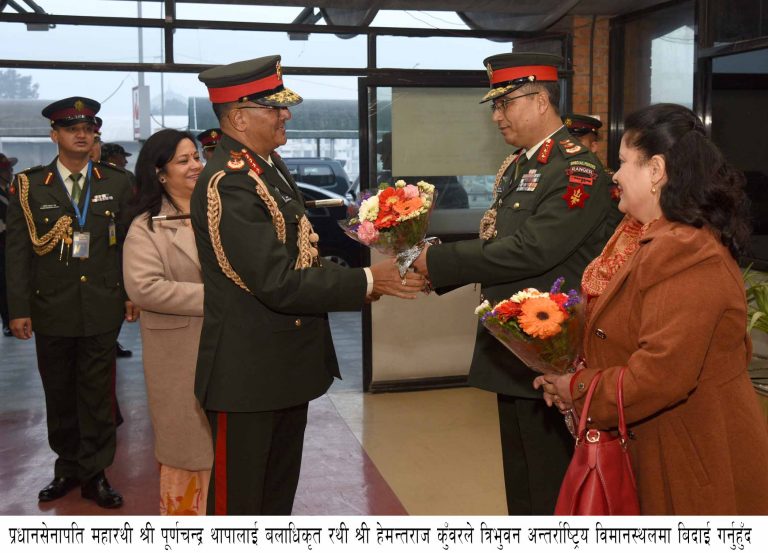 काठमाडौ (नेस) । प्रधानसेनापति पूर्णचन्द्र थापा भारतका स्थल सेनाध्यक्ष जनरल विपिन रावतको औपचारिक निमन्त्रणामा शुक्रबार साताब्यापी भ्रमणकालागि त्यसतर्फ प्रस्थान गर्नुभयो ।