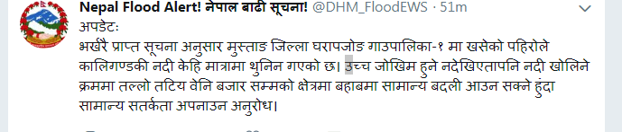 जलवायु तथा मौसम विज्ञान विभागले कालीगण्डकीको तल्लो तटिय क्षेत्रका बासिन्दालाई सतर्कता अपनाउन आग्रह गरेको छ ।