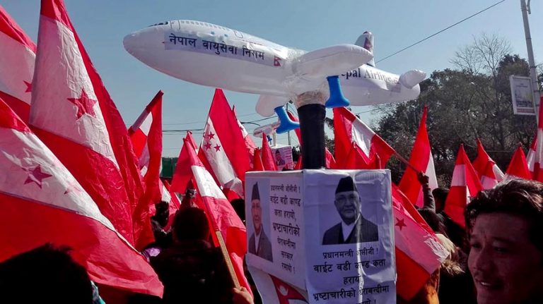 सरकारको गलत क्रियाकलापको भण्डाफोर गर्ने उदेश्यले सडक संघर्षमा उत्रिएको नेपाली कांग्रेसले राजधानीमा आयोजित प्रदर्शनमा ‘प्रधानमन्त्री ओलीजी वाइड बडी काण्ड कता हरायो, भ्रष्टाचारीको घेराबन्दीमा सरकार रमायो’ लेखेर प्लाष्टिकको वाइड बडी बिमानसहित सरकार बिरुद्ध नाराबाजी गरेको थियो ।