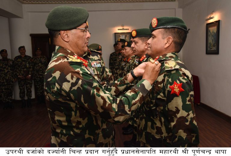 काठमाडौ (नेस) उपरथी दर्जामा पदोन्नती हुनु भएका पाँच जना सहायक रथीहरु बालकृष्ण कार्की,सरोज प्रताप राणा, अनन्त कार्की, सिताराम खड्का र ताराध्वज पाण्डेलाई जंगी अड्डामा आयोजित एक कार्यक्रमकाबीच बीच प्रधानसेनापति पूर्णचन्द्र थापाले उपरथी दर्जाको दज्र्यानी चिन्ह प्रदान गर्नु भएको छ ।