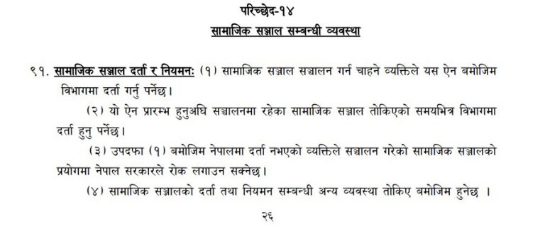 सरकारले गत विहीबार नै संसदमा सामाजिक सञ्जाल सञ्चालन गर्न नेपालमै दर्ता हुनु पर्ने प्रावधानसहितको सूचनाप्रविधि सम्बन्धि व्यवस्था गर्न बनेको विधेयक २०७५ दर्ता गराएको छ । विद्युतीय कारोवार ऐनलाई खारेज गरी नयाँ कानून बनाउने उद्देश्यसहित ल्याएको विधेयकमा भनिएको छ, ‘ सामाजिक सञ्जाल सञ्चालन गर्न चाहने व्यक्ति वा संस्थाले नेपालको सरकारी निकायमा दर्ता हुनु पर्छ ।’