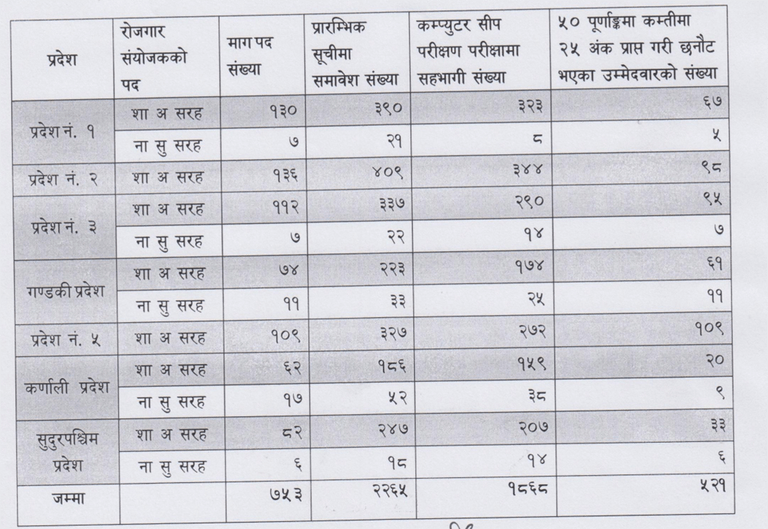 सातै प्रदेशका हरेक स्थानीय तहमा रहने गरी ७५३ जना रोजगार संयोजक माग गरिए पनि ५२१ जना मात्रै छानिएका मन्त्रालयका प्रवक्ता डा. नारायण रेग्मीले जानकारी दिएका छन् । सर्टलिस्ट गरिएकामध्ये कम्प्युटर प्रणालीबाट २५ अंकभन्दा कम ल्याउनेहरू असफल भएका छन् । अधिकांश युवाहरु कम्प्युटरको सीप परीक्षामा अनुत्तीर्ण भएका छन् ।