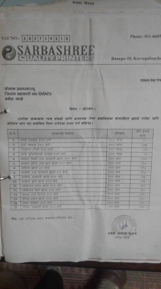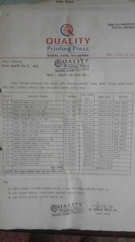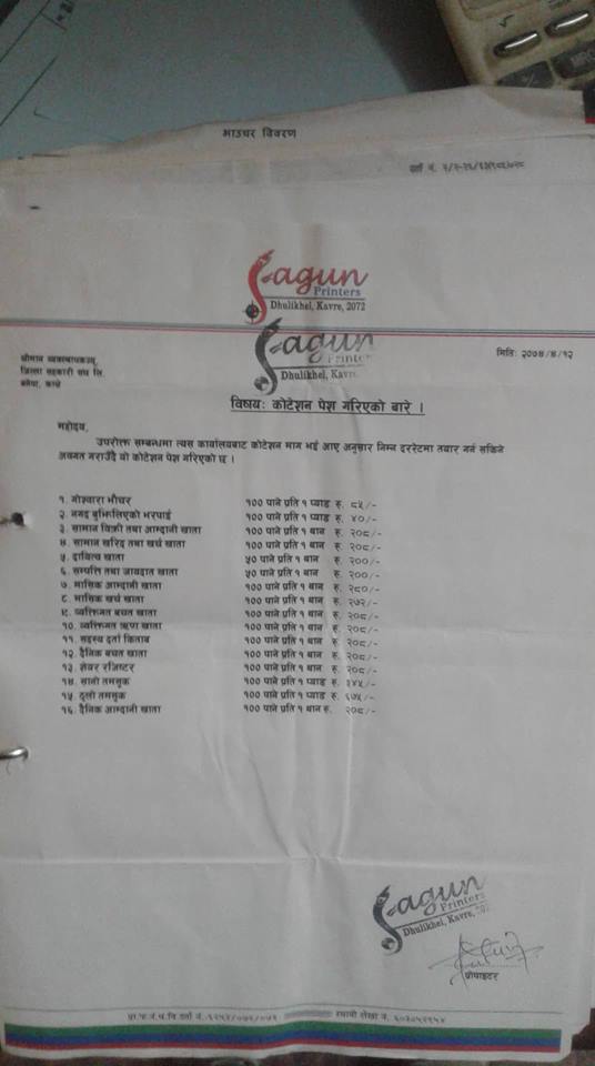 जिल्ला सहकारी संघमा आवश्यक पर्ने सामाग्रीहरु छपाईका लागि किर्ते कागजात तयार गरि पेश गरिएको छ । सगुन प्रिन्टर्स धुलिखेलको नाममा २०७४ साल साउन १२ गते दर्ता गरिएको कोटेशन नक्कली हो । त्यसका प्रोपाईटर जीवन श्रेष्ठलाई जानकारी नै नदिई उनको कम्पनीको छाप, लेटरप्याड तयार गरी जिल्ला संघमा कोटेशन पेश गरिएको छ । सगुन प्रिन्टर्सका प्रोपाईटर जीवन श्रेष्ठलाई समेत कोटेशनका बारेमा जानकारी छैन । कोटेशनमा भएका सबै सामाग्री छापिएका छैनन । कम दररेटको कोटेशन लुकाईएको छ ।