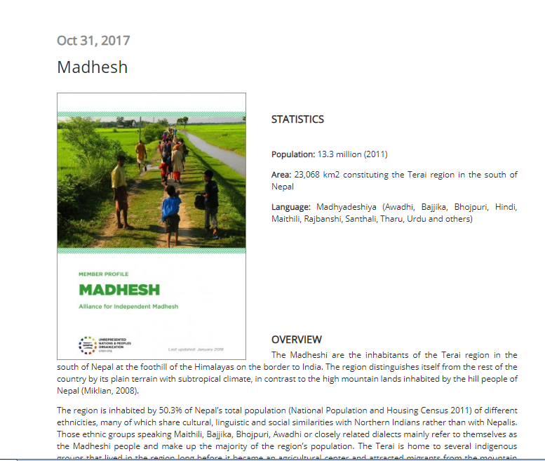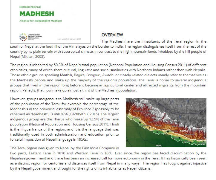 मधेस इष्ट इण्डिया कम्पनीले दुई चरणमा गरी तराई क्षेत्र नेपाललाई दिएको, नेपाल सरकारले विभेदमा पारेको, शताब्दीऔंदेखि नेपालभन्दा फरक र टाढा रहेको, यहाँका मानिसहरु नेपाल सरकारको अन्यायविरुद्ध लडेको इत्यादि यूएनपीओमा उल्लेख छ ।