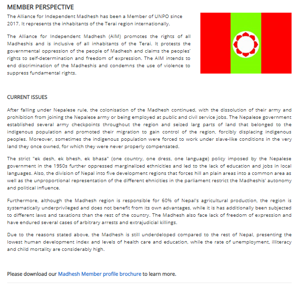 मधेसमा नेपालको औपनिवेशीकरण रहेको, मधेसीहरुलाई सेना र सरकारी जागिरबाट बञ्चित गरिएको, मधेसीलाई नियन्त्रण गर्न जनताको जग्गा जबर्जस्ती कब्जा गरेर कैयौं सैनिक पोष्ट खडा गरिएको, तराईवासीलाई अरू नेपालीभन्दा बढी कर लगाइएको, अभिव्यक्ति स्वतन्त्रता खोसिएको, स्वेच्छाचारी गिरफ्तारी र गैरन्यायिक हत्या भइरहेको यूएनपीओको बेवसाइटमा उल्लेख छ ।