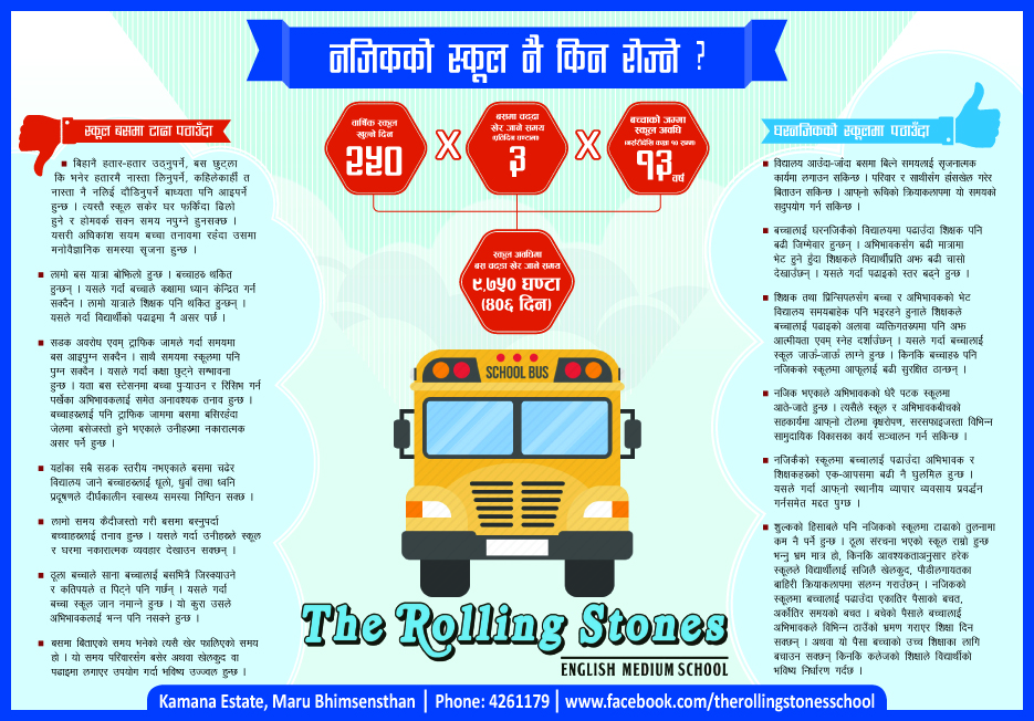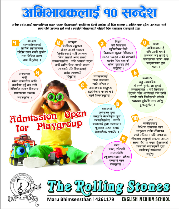 अन्य विद्यालयको दाँजोमा न्यून शुल्क, पर्याप्त भौतिक सुविधा, खुला क्षेत्र, खेल मैदान भएको यो विद्यालय कक्षा १० सम्म सञ्चालन हँुदै आएको छ । विशेष गरी आफ्ना छोराछोरीलाई समाजसँग घुलमिल गर्न सजिलो होस् भन्ने उद्देश्यले सामाजिक क्रियाकलापमा बढी केन्द्रित यस विद्यालयमा हाल करिब ४ सय विद्यार्थी अध्ययनरत छन् । व्यावहारिक ज्ञान र सीपसँग जोडेर प्रयोगात्मक कक्षा सञ्चालन गर्ने यो विद्यालयमा कुशल शिक्षक छन् । अंग्रेजी माध्यममा पठनपाठन हुँदै आएको द रोलिङ स्टोन्स स्कुल काठमाडौंको कोर क्षेत्रको उत्कृष्ट विद्यालय हो ।