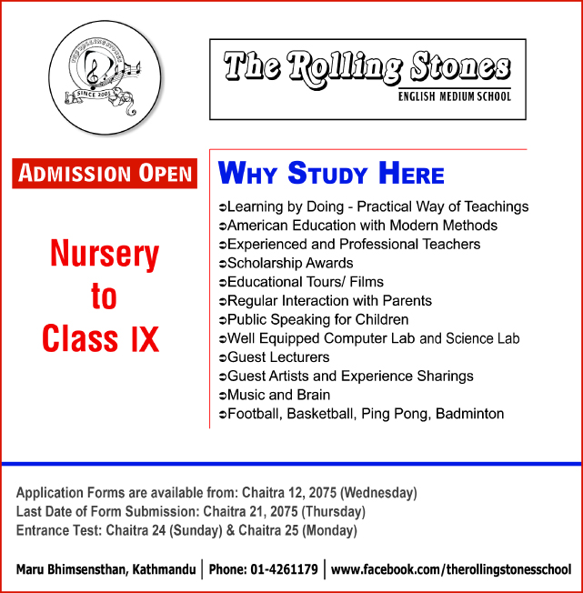 काठमाडाैं । शिक्षा नै देश निर्माणको आधारशीला भन्ने मूल उद्देश्यका साथ सन् २००५ मा स्थापना भएको द रोलिङ स्टोन्स स्कुल छोटो समयमा नाम कमाएको विद्यालय हो । मध्य शहरभित्र रहेर पनि शान्त तथा सुरक्षित वातावरणमा सञ्चालित यो विद्यालय मुलुककै पर्यटकीय नगरी हनुमानढोका दरबार क्षेत्र नजिक रहेको छ । सन् २०१२ मा कामना होल्डिङ्सले खरिद गरेको यो विद्यालय गुणस्तरीय शिक्षा दिन प्रतिबद्ध छ । कामना होल्डिङ्सको कुशल व्यवस्थापनमा सञ्चालित यो विद्यालयमा प्रारम्भिक बालविकासदेखि माध्यमिक शिक्षासम्म अध्यापन हुने गरेको छ । अमेरिकामा स्नातकोत्तर तह सम्पन्न गरी नेपाल फर्किएका युवा समूहको लगानी रहेको यो विद्यालयले समाज विकासका लागि महत्वपूर्ण योगदान गरेको छ ।