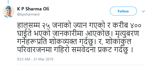 उद्धारमा गंभीर हुन र घाईतेको उपचारमा कुनै कमी आउन नदिन समेत प्रधानमन्त्रीले निर्देशन गरेको ट्विटमा उल्लेख छ।