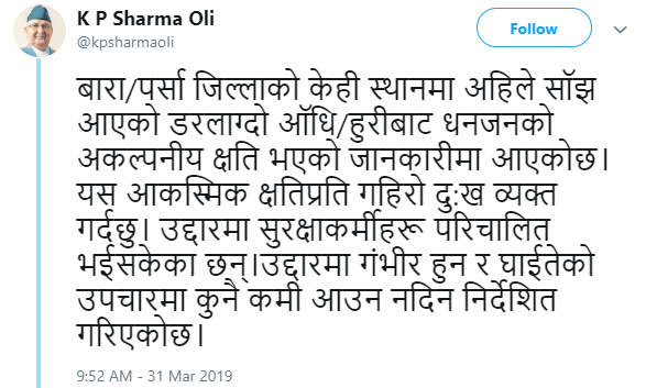 यसैबीच प्रधानमन्त्री केपी शर्मा ओलीले डरलाग्दो ऑधि/हुरीबाट धनजनको अकल्पनीय क्षति भएको भन्दै दुःख व्यक्त गरेका छन्।