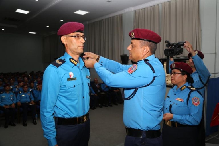काठमाडौं, प्रहरी महानिरीक्षक सर्वेन्द्र खनालले हालै पदोन्नति हुनुभएका ३ जना प्रहरी नायव महानिरीक्षकहरुलाई प्रहरी प्रधान कार्यालयमा आइतबार आयोजित कार्यक्रममा दर्ज्यानी चिन्हद्वारा सुशोभन गर्नुभयो ।