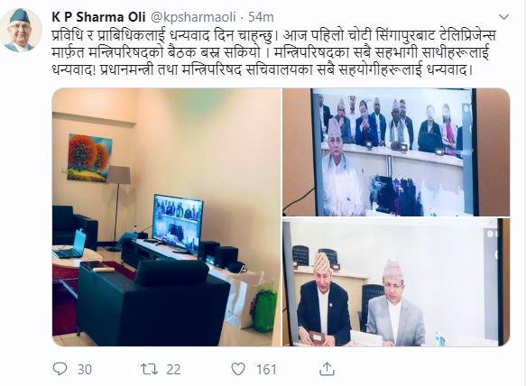 प्रधानमन्त्री सिंगापुर जानुअघि मन्त्रिपरिषद् बैठकले भिडिओ कन्फेरेन्समार्फत् पनि मन्त्रिपरिषद् बैठक बस्न सकिने निर्णय गरेको थियो।