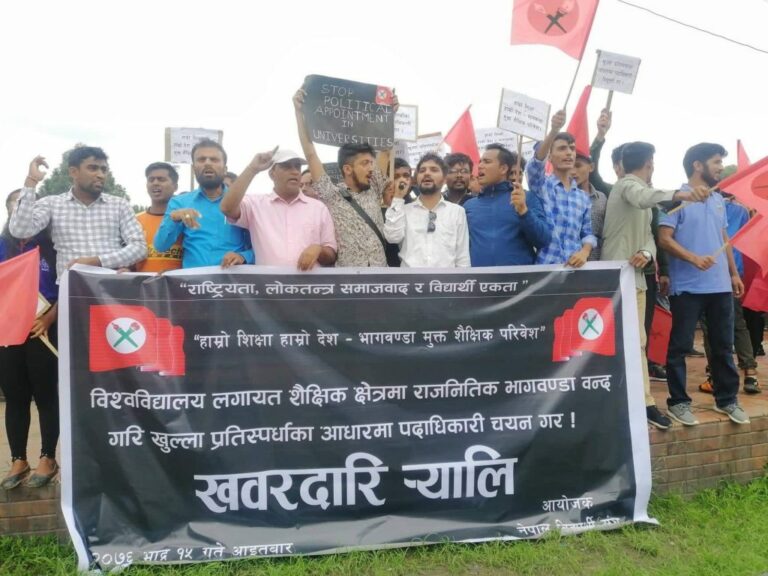 काठमाडौं, (नेस) ।दलीय भागबन्डाका कारण विश्वविद्यालयको शैक्षिक वातावरण बिग्रिएको आरोप लगाउँदै नेविसंघले खबरदारी र्याली निकालेको छ। नेविसंघले आइतबार माइतीघर मण्डलाबाट बानेश्वरसम्म र्याली निकालेको हो।
