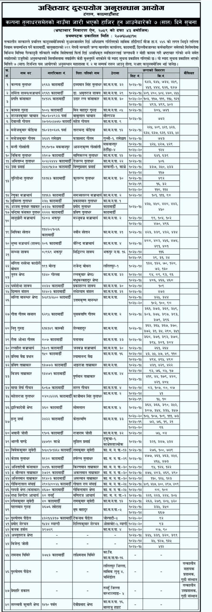 अख्तियारमा उपस्थित हुन जारी गरिएको सूचनामा कामना गुरुङ, कल्पना तुलाधर, शर्मिला शाक्य, प्रगति कंशकार, मनोज कुमार केडियालगायतका ५८ जनाको नाम छ ।