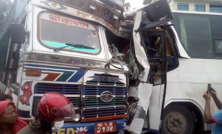 काठमाडौबाट महादेववेशीतर्फ ग्यास बोकेर लैजाँदै गरेको ना १ क २१७४ नम्बर को ट्रक र मुग्लिनबाट काठमाडौतर्फ जाँदै गरेको ना ६ ख १७३७ नम्बर को मकालु बस आपसमा ठोक्किँदा दुर्घटना भएको प्रहरीले जनाएको छ ।