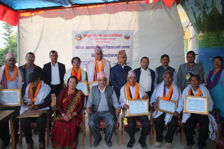 चाँगुनारायण नगरपालिका–९ ताथलीस्थित देवि माध्यामिक विद्यालयमा आयोजना गरिएको कार्यक्रममा चाँगुनारायण नगरपालिकाका प्रमुख सोम प्रसाद मिश्रले शिक्षक पेशा सम्मानीय पेशा भएको बताउदै नेपालमा नै स्वेच्छिक अवकाश लिने शिक्षकलाई सम्मान गर्ने परम्परालाई नगरपालिकाले अंगिकार गर्ने नीति लिएको बताउनुभयो ।