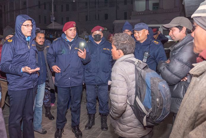 काठमाडौँ । शुक्रबार राति ९ बजे महानगरीय प्रहरी कार्यालयका प्रमुख प्रहरी नायब महानिरीक्षक विश्वराज पोखरेल (डिआइजी)सहितको टोली सडक अनुगमनमा थियो । टोलीमा काठमाडौँ महानगरपालिका, मानवसेवा आश्रम, प्रहरी, पत्रकार र विभिन्न सङ्घसंस्थाका प्रतिनिधिहरु सहभागी थिए । काठमाडौँको कमलादीस्थित गणेशमन्दिर नजिक सडकछेउमा बन्दोबस्तीको ओढ्ने ओछ्याउनेसहित एक दम्पत्ति सुत्ने तरखरमा थिए । चिसोका कारण खोकी लागेकाले श्रीमती औषधि खाँदै त श्रीमान् मदिरामा लठ्ठ भेटिए ।